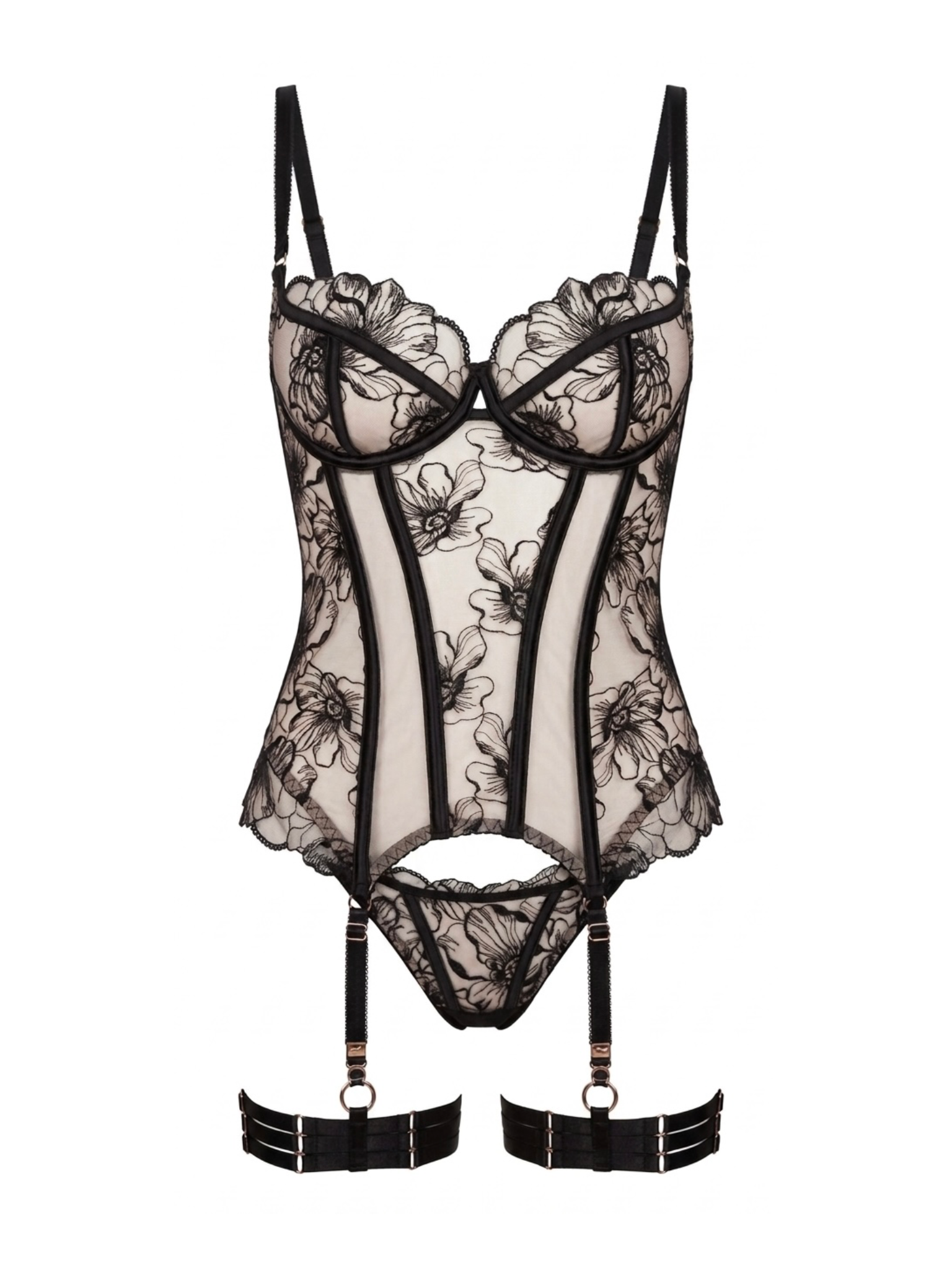 Must lilledetailidega mesh korsett set jalarakmete ja püksikutega