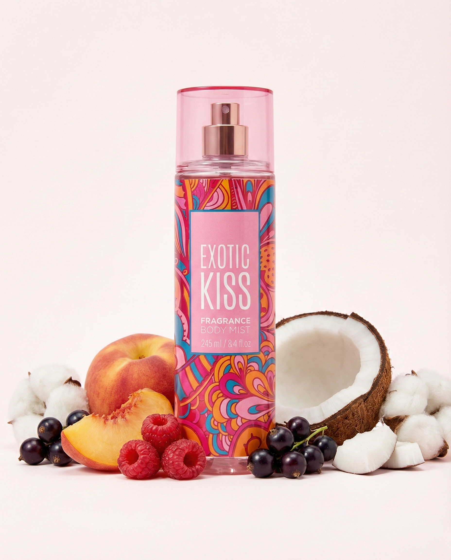 Sukeldu eksootiliste ja sensuaalsete aroomide maailma! EXOTIC KISS kehasprei ühendab mahlaka virsiku, küpse vaarika ja aromaatse mustsõstra magusa-hapu harmoonia, mida täiendab intensiivne lilleline süda ja ahvatlev eksootiline kookos. Lõhna täiendavad magusad dessert-noodid ja sügav muskus, mis jätavad nahale kauakestva ja lummava lõhna.