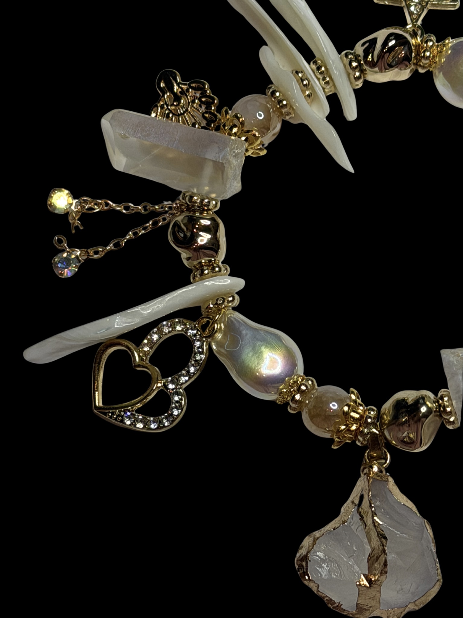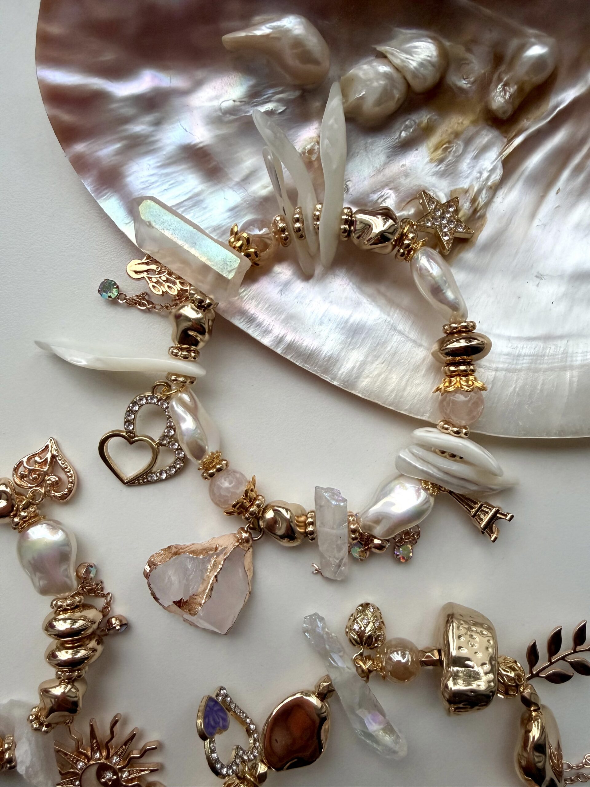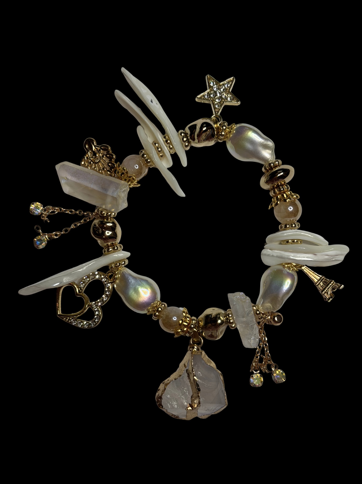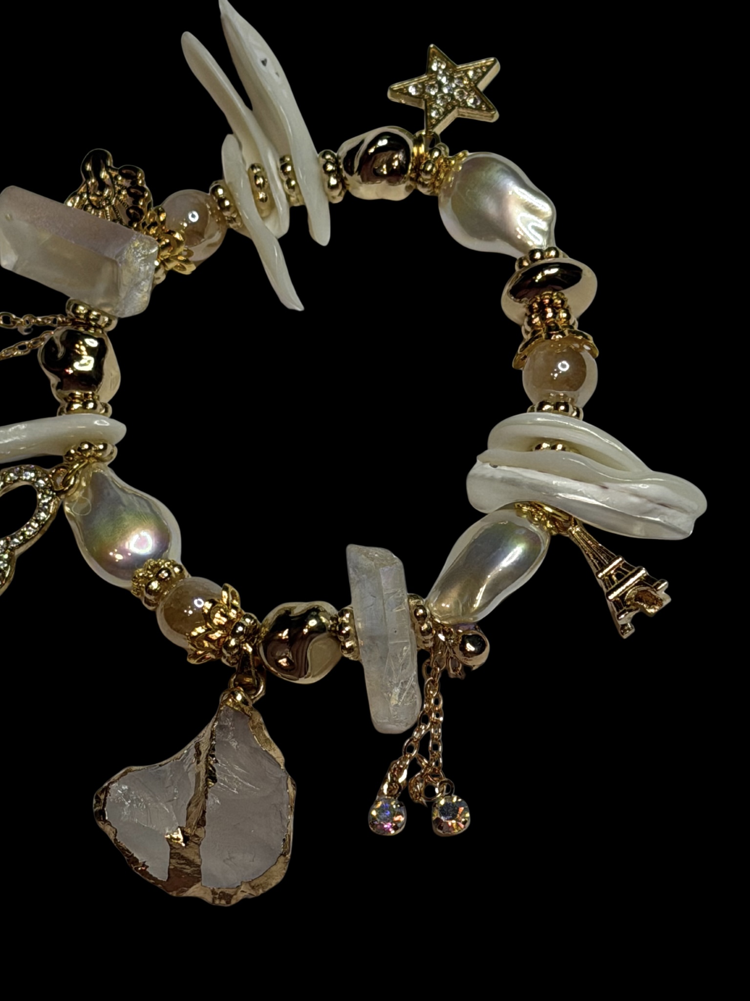 Nautige käsitsi valmistatud disaini ilu selle ainulaadse käevõruga, mis on valmistatud hoolikalt valitud kividest. Kõrge kvaliteediga kunstpärlite kõrval leiate ka looduslikke pärleid, mis on loetletud allpool.