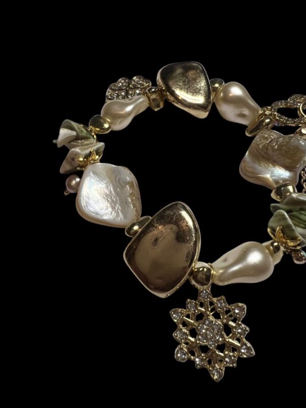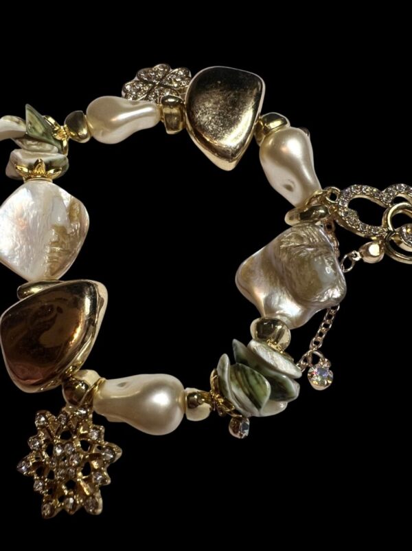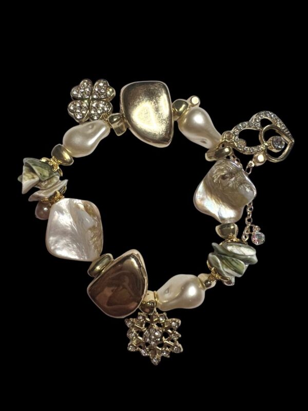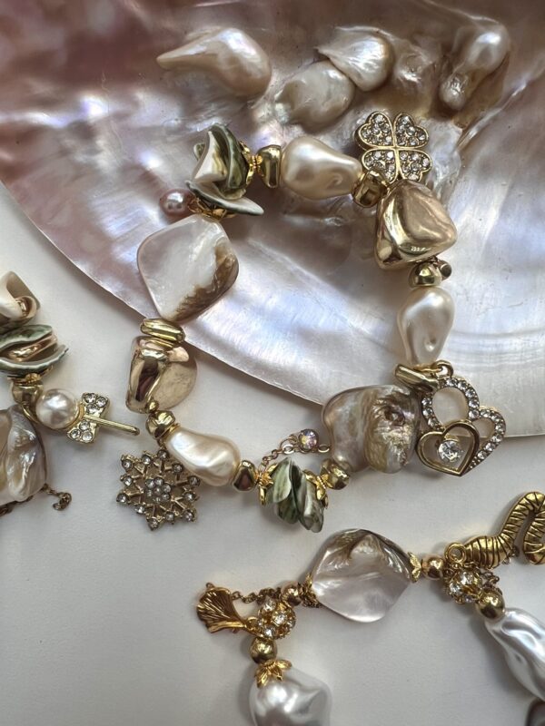 Nautige käsitsi valmistatud disaini ilu selle ainulaadse käevõruga, mis on valmistatud hoolikalt valitud kividest. Kõrge kvaliteediga kunstpärlite kõrval leiate ka looduslikke pärleid, mis on loetletud allpool.