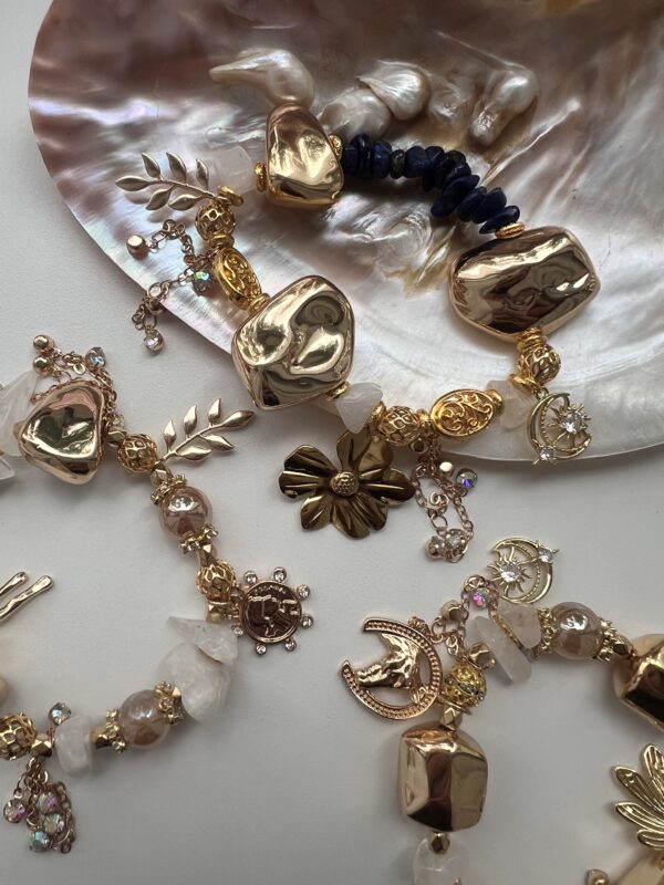 Nautige käsitsi valmistatud disaini ilu selle ainulaadse käevõruga, mis on valmistatud hoolikalt valitud kividest. Kõrge kvaliteediga kunstpärlite kõrval leiate ka looduslikke pärleid, mis on loetletud allpool.